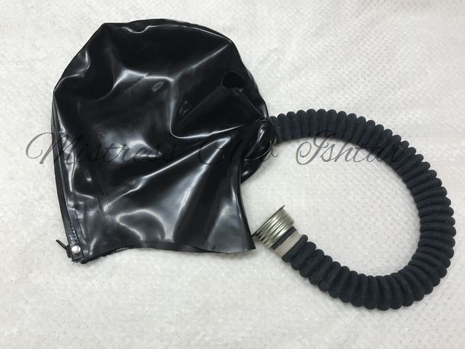 Mistress Saran's tools:Latex full mask with hose for rental
